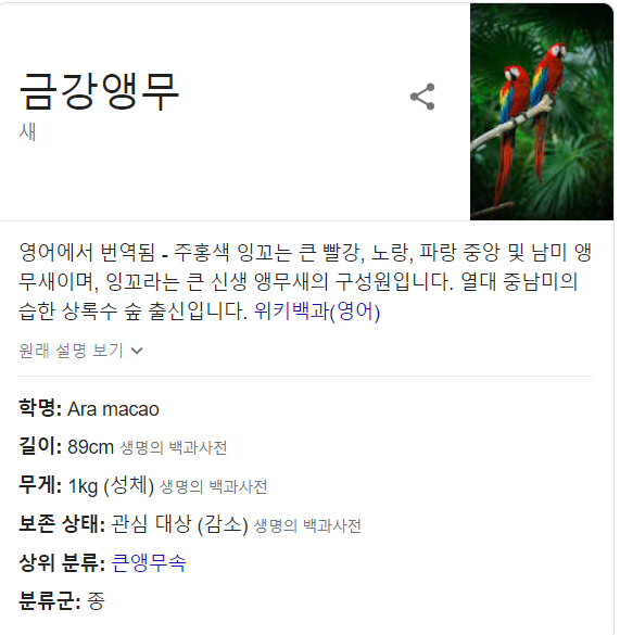 금강앵무새라고 하네요. 사진보니 위의 예제 사진과 동일한 새입니다.