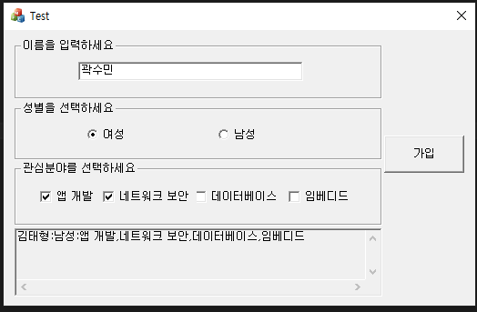 | Group Box | IDC_STATIC | Caption : 관심분야를 선택하세요 (예 : 앱 개발 , 데이터 베이스) |