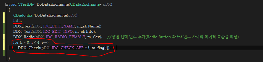 이제 TestDlg.cpp 파일로 넘어와서 DoDataExchange()함수에 Radio Button 과 Edit Control 변수를 추가해줍니다.
