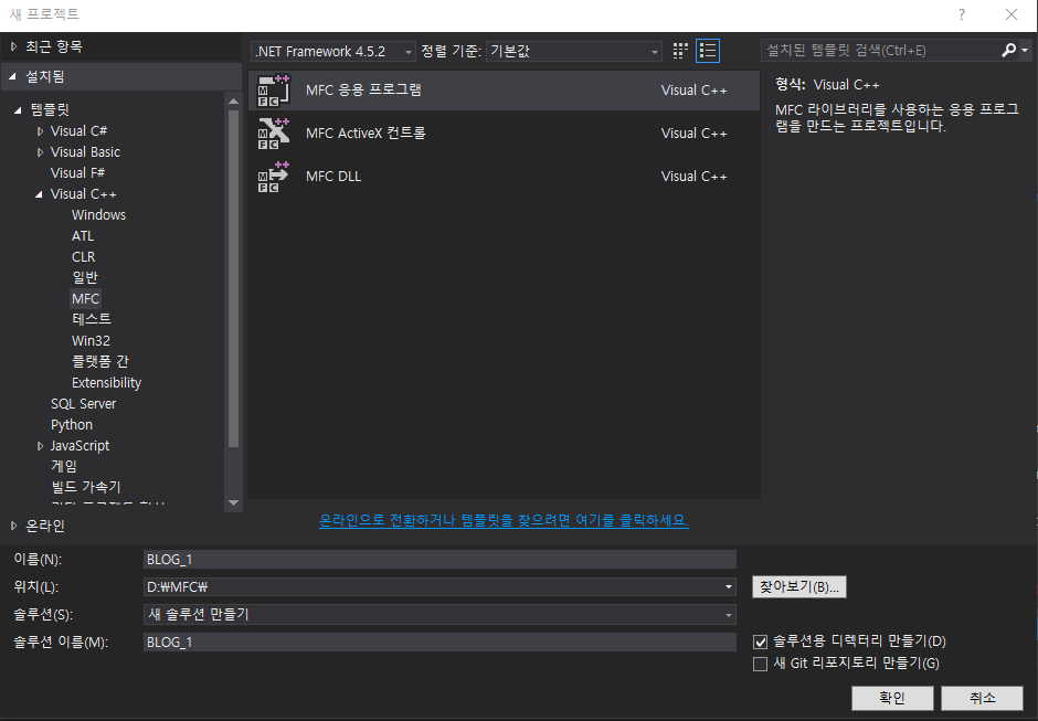 안녕하세요. 본 게시물에서는 대화상자 기반 MFC 프로젝트를 생성하고 위의 사진과 같이 간단한 예제를 만들 것입니다. 본 설명은 Visual Studio 2015 기준으로 진행하고 있습니다. 우선 MFC 프로젝트